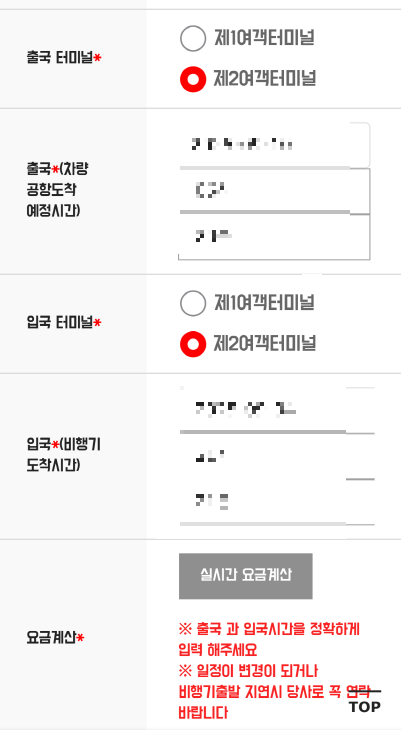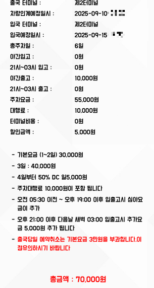 출국 및 입국 터미널을 선택하고 도착 시간을 선택하고 "실시간 요금계산"을 하면 끝 ~ 저희는 외부주차여도 괜찮았어서 외부로 했고, 야간출고라서 1만원 추가에 4일이 넘어서 5천원 할인을 받을 수 있었습니다. (조금 더 일찍 예약하거나 장기로 이용할 경우 할인하는 경우가 있어서 홈페이지를 잘 이용하시면 좋은 요금으로 이용하실 수 있을 것 같아요 ~*)