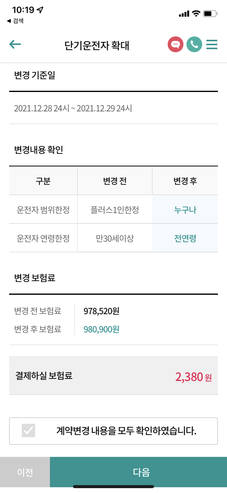 - 가입 방법 : 가입후 로그인 - 계약변경(단기운전자 확대) - 변경 기준일 확인 - 변경조건(누구나/전연령 운전) - 변경내용확인 & 변경 보험료 확인 - 결제완료