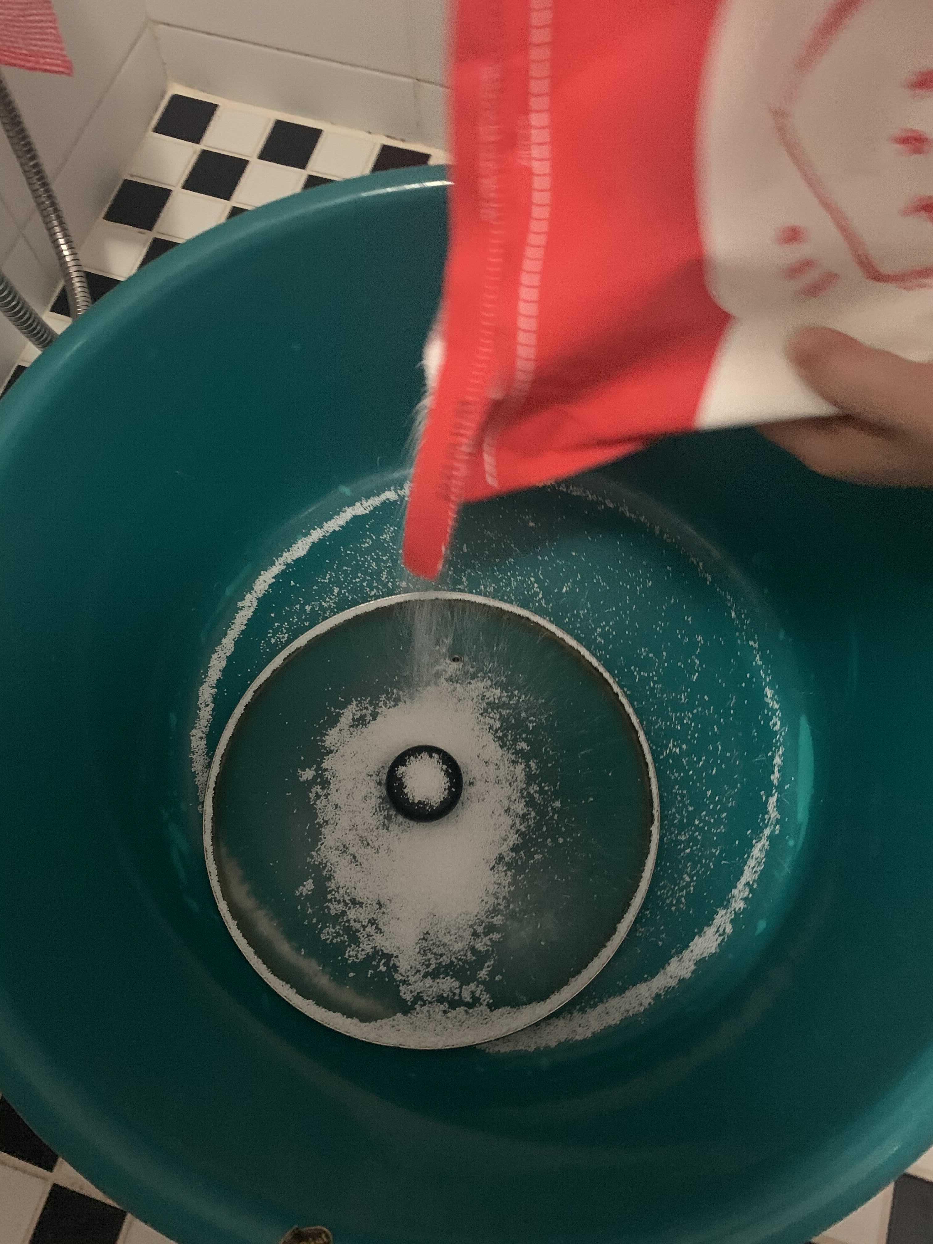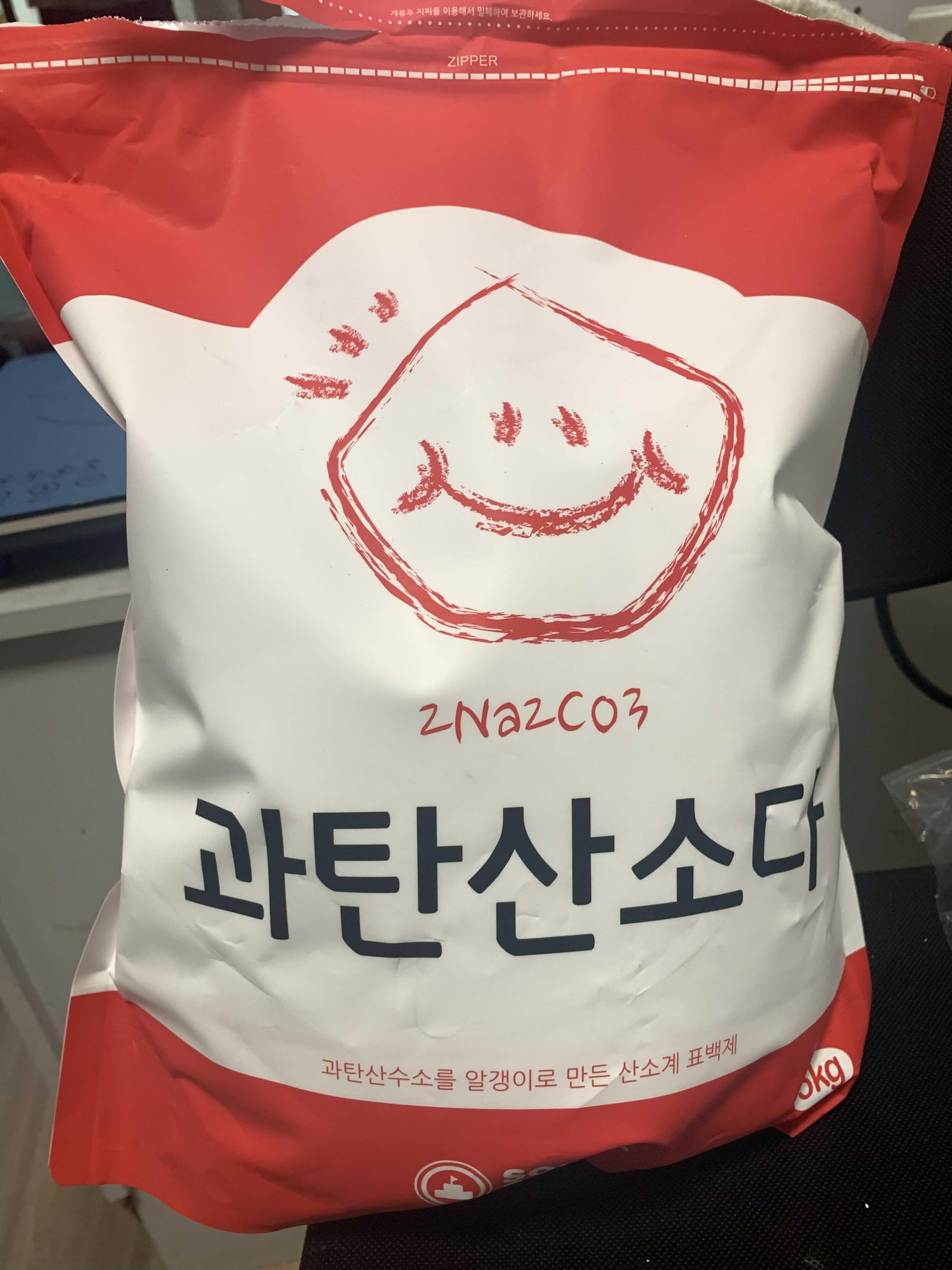 냄비뚜껑에 이어 2번째 발단이 되었던 가스레인지 후드입니다. 마찬가지로 과탄산소다를 준비합니다. 냄비뚜껑을 했던 흔적이 고스란이 남아있네요. 여기에 과탄산소다를 조금 더 부어주도록