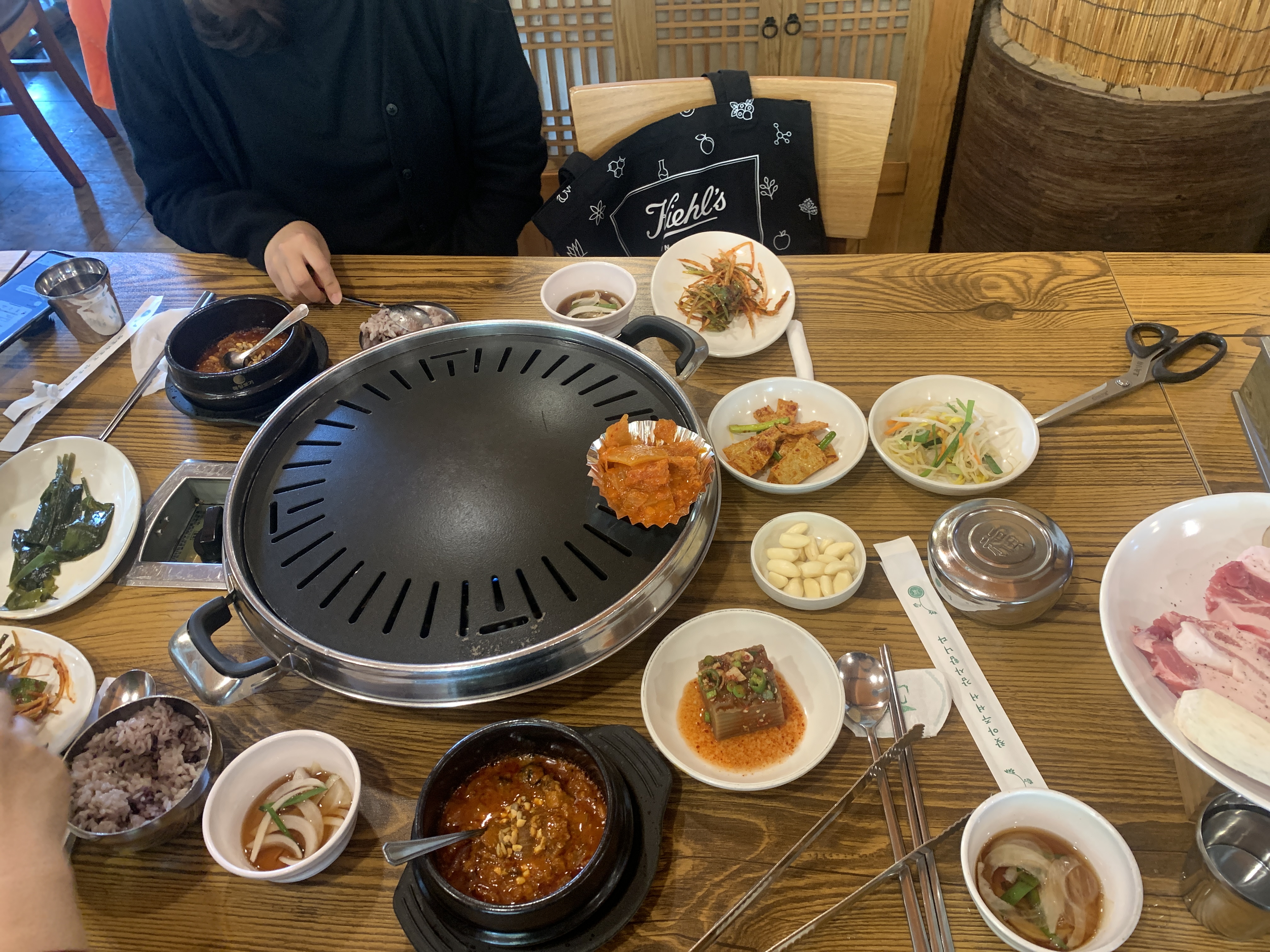 불판이 세팅되고, 강된장과 간단한 반찬들,