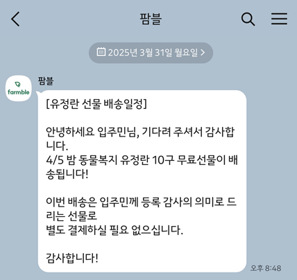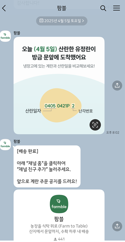 - 팜블 서비스는 신선한 달걀을 간편하게 배송받을 수 있는 훌륭한 서비스인 듯 합니다.