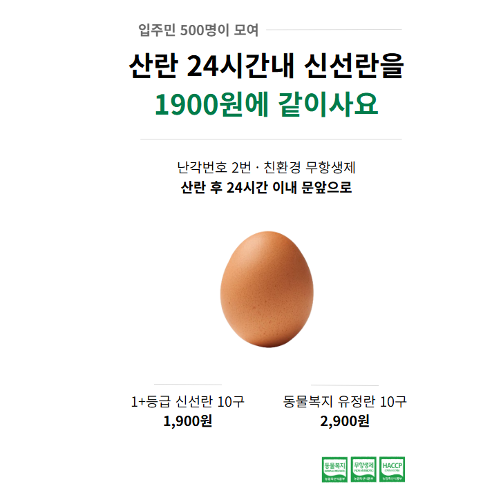 - 어떻게 : 같은 아파트 입주민 500명만 모이면 초신선한 달걀을 우리집 앞으로!