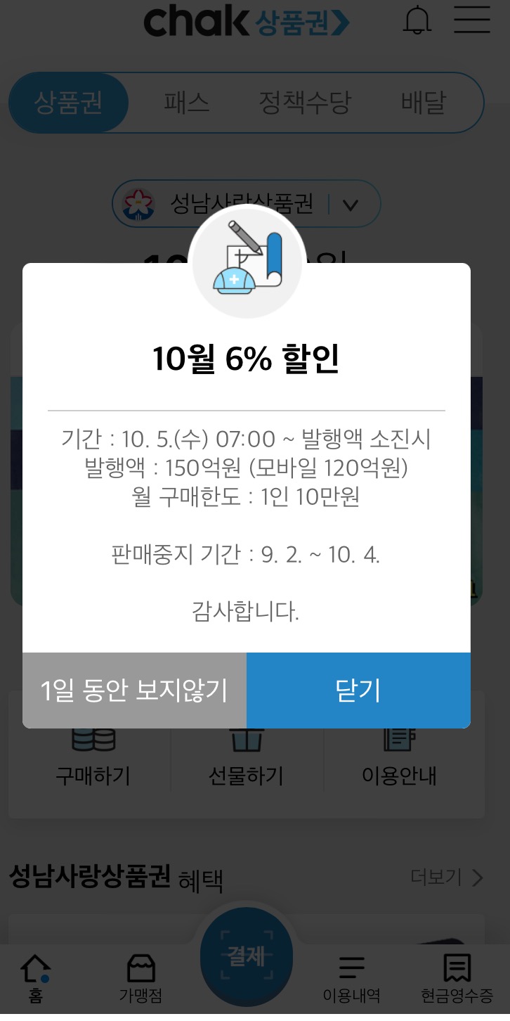 성남상품권이란?(이하 참조 : 성남시 홈페이지 https://www.seongnam.go.kr/city/1000327/10201/contents.do) 「성남사랑 상품권」은 어려움을 겪고 있는 전통시장과 영세 상점가를 살리고 「성남사랑 상품권」