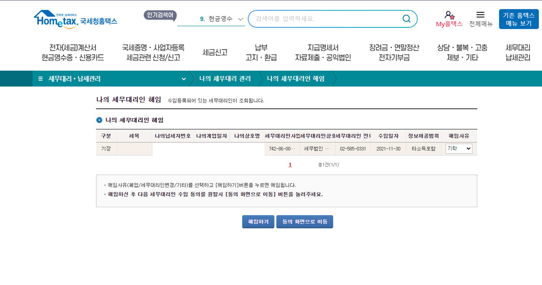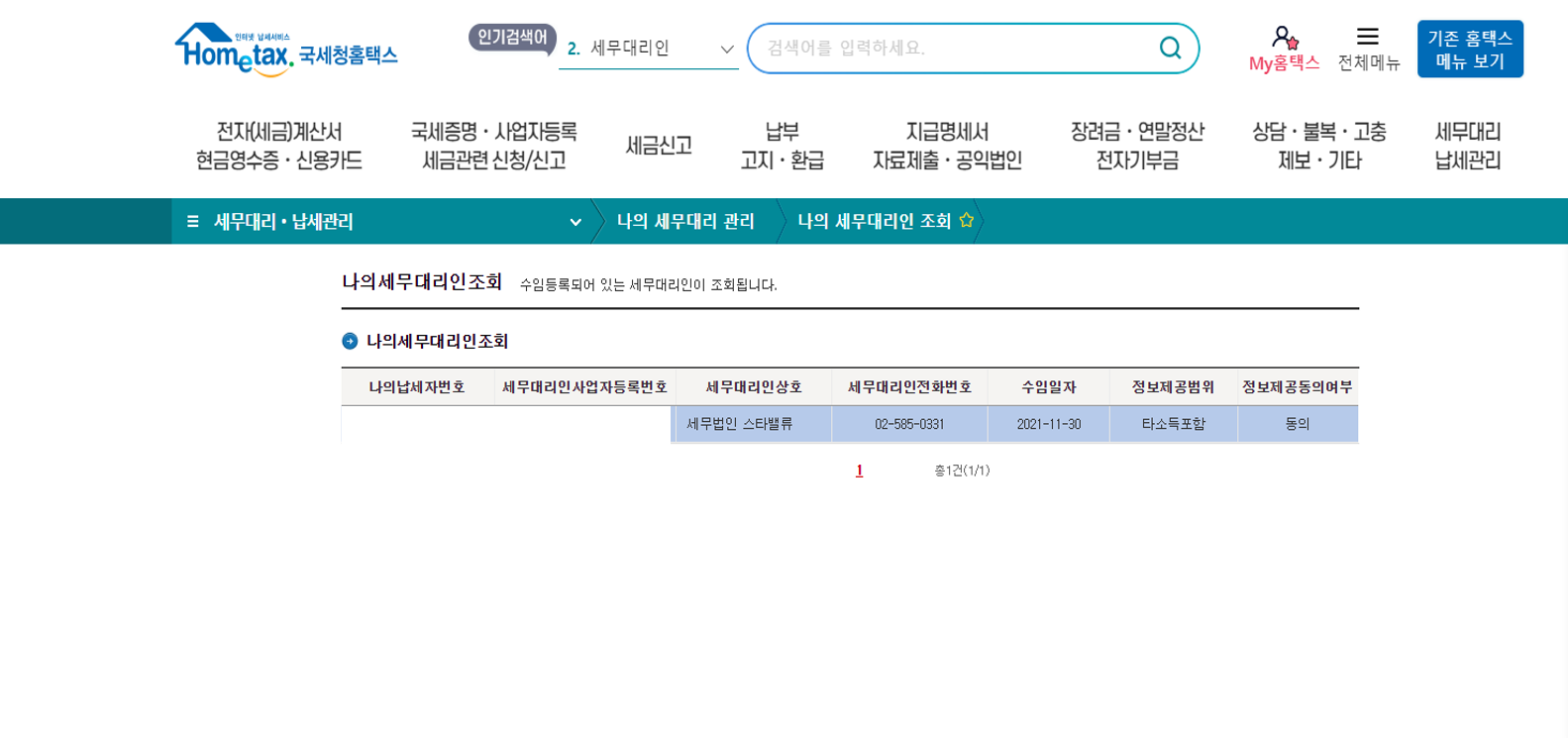 [세무대리ㆍ납세관리 > 나의 세무대리 관리 > 나의 세무대리인 조회]