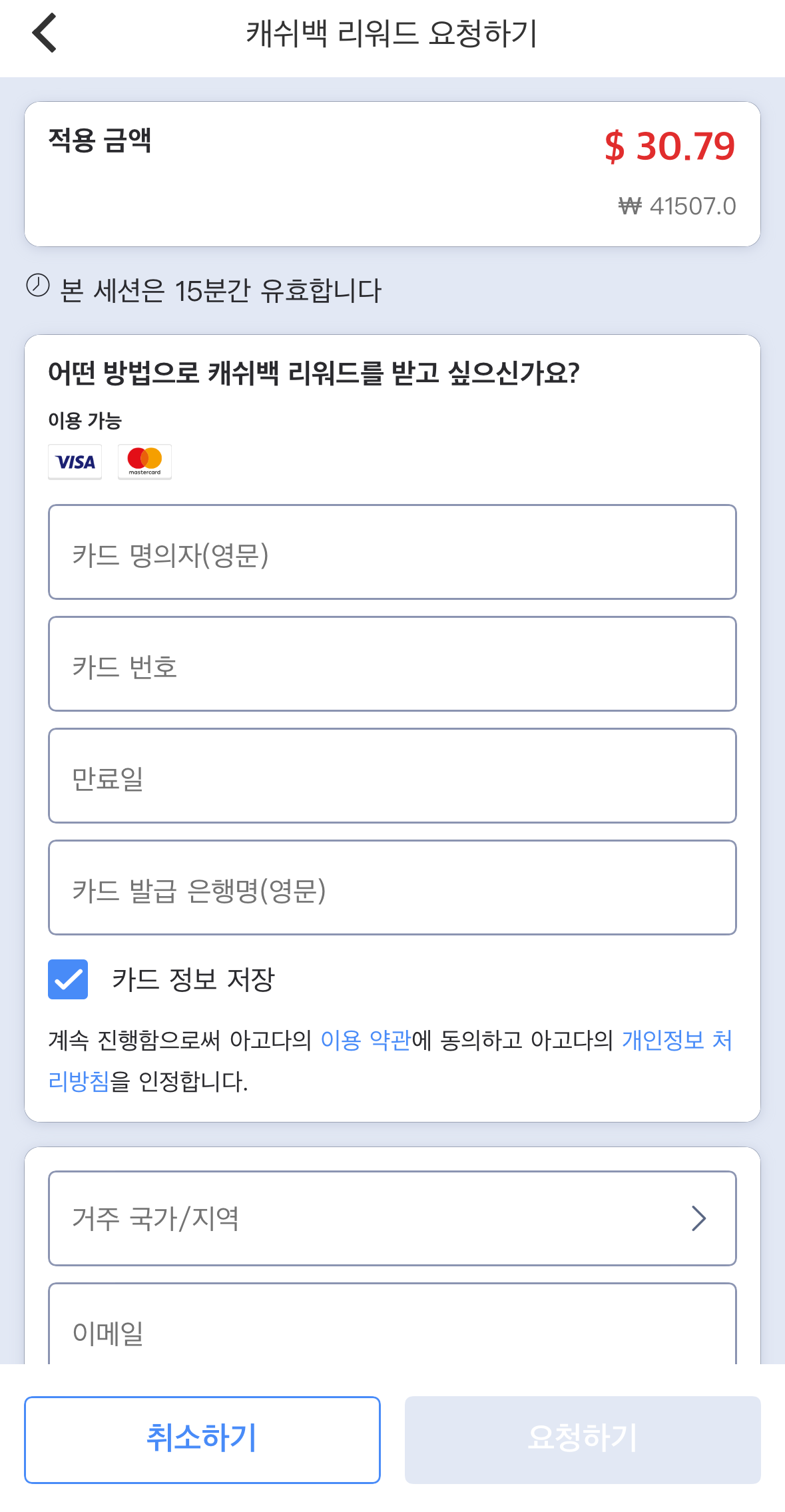 돌려받을 카드 정보를 입력하고,