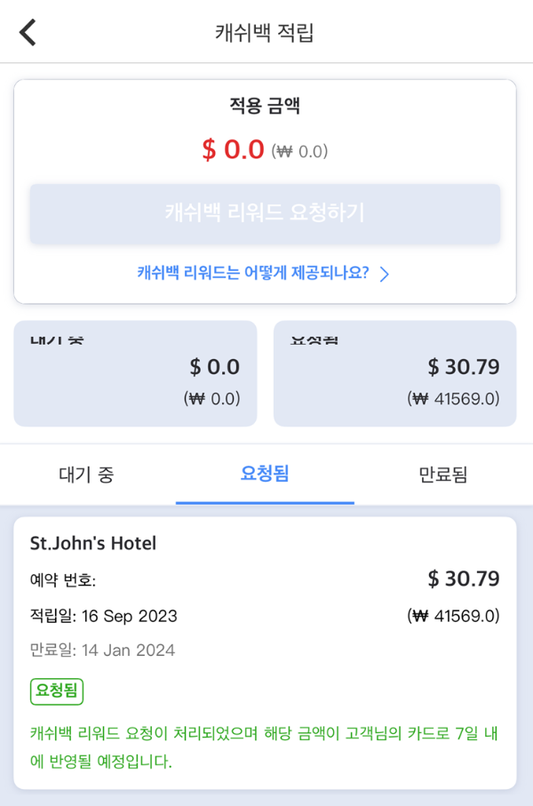 - 숙소에서 숙박을 한 후 체크아웃 날짜로부터 최대 60일 이후에 캐시로 돌려받는 것