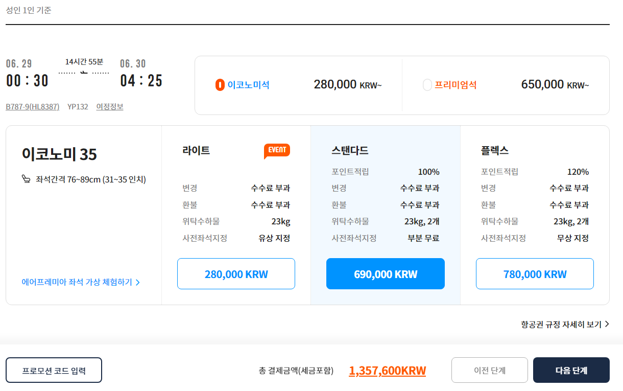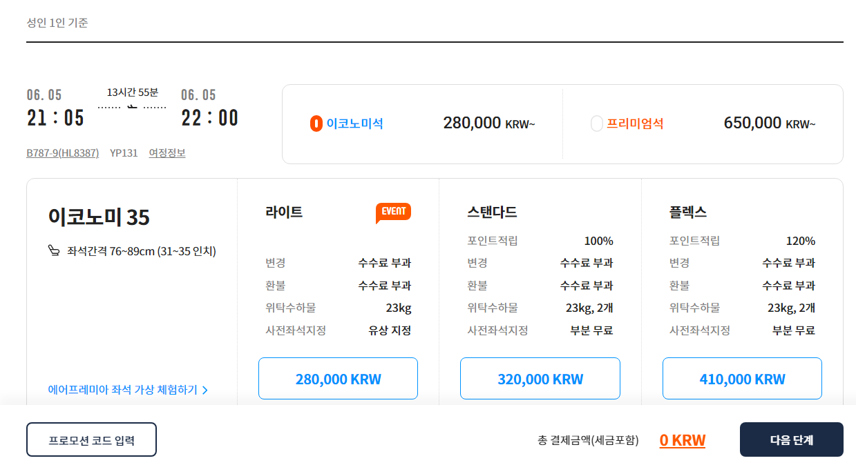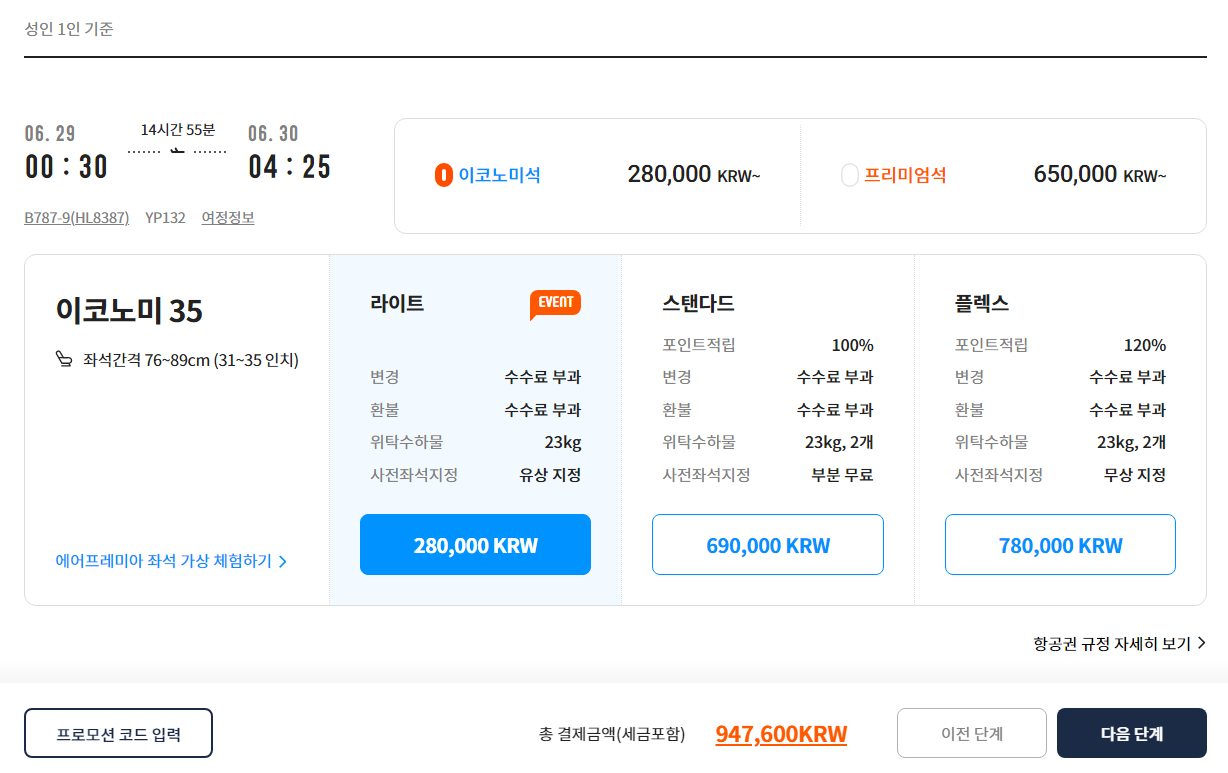 이코노미석 28만원을 선택하면