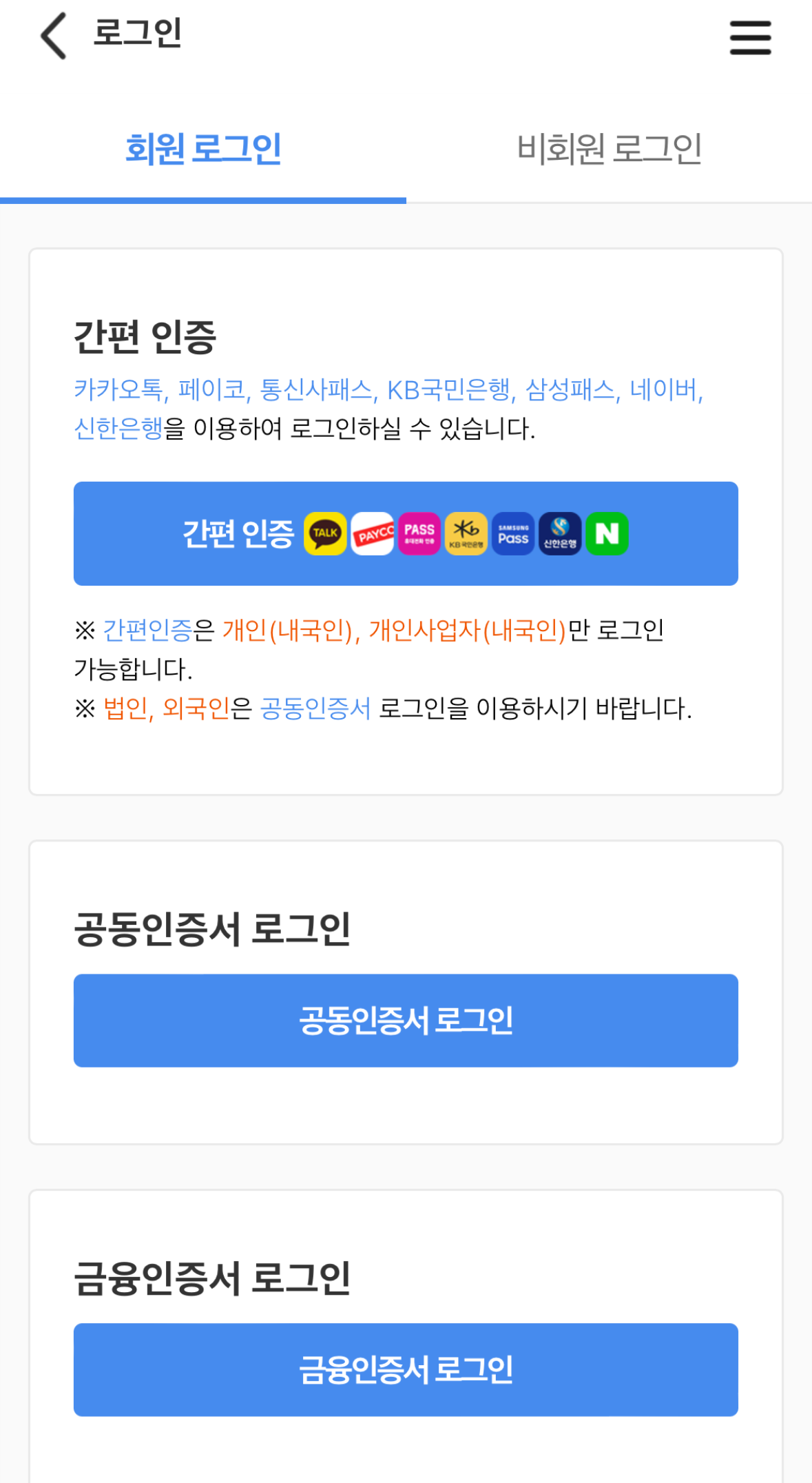 간편/공동/금융인증서를 이용하여