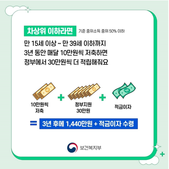 - 3년 동안 매달 10만원씩 저축하면 정부에서 30만원씩 적립
