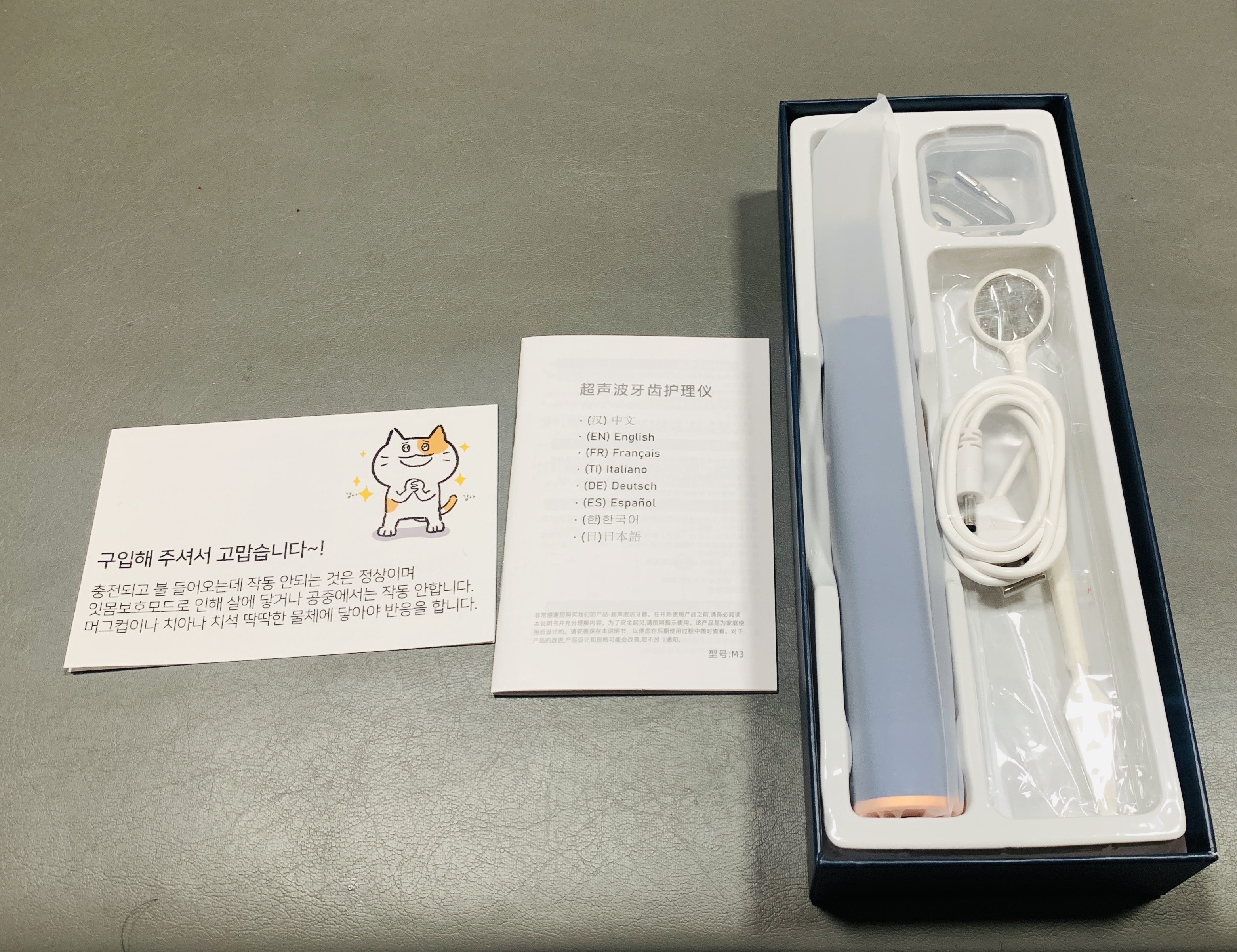 본체, 구강경, 여분헤드 2개, 미니스패너, USB 충전케이블