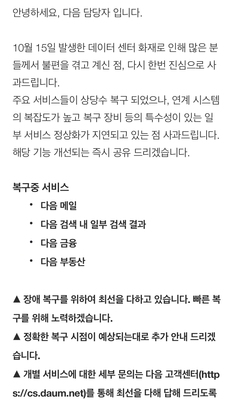 안녕하세요, 카카오 각자대표 남궁훈, 홍은택 입니다. 오늘 발생한 데이터센터 화재로 인해 카카오톡을 비롯한 다음, 카카오 T, 카카오페이 등 카카오 서비스 장애로 불편을 겪고 계신 모든 이용자분들께 고개 숙여 진심으로 사과드립니다. 카카오는 현재 최대한 빠르게 서비스를 정상화하기 위해 노력하고 있으며, 이번 사건의 원인을 철저히 규명하고 재발 방지를 위해 할수 있는 최대한의 조치를 취할 것을 약속드립니다. 먼저 이번 장애의 원인에 대해 말씀드리겠습니다. 10/15 오후 3시 30분경, 카카오가 입주해 있는 SK C&C 판교 데이터센터에 화재가 발생했습니다. 해당 화재로 인해 카카오의 장비가 위치해 있는 구역에 전원 공급이 차단되었고, 그로 인한 서비스 장애가 일어났습니다. 소방 당국의 신속한 조치로 현재 화재 진압은 완료되었으나, 안전상의 이유로 데이터센터에 즉시 전원을 공급하기 어려워 장애 해결이 지연되고 있는 상황입니다. 카카오는 이를 인지한 즉시 다른 데이터센터를 이용해 서비스를 정상화하기 위한 최선의 조치를 취하고 있습니다. 카카오는 모든 데이터를 국내 여러 데이터센터에 분할 백업하고 있으며, 외부 상황에 따른 장애 대응을 위한 이원화 시스템을 가지고 있습니다. 이번 화재가 발생한 직후, 카카오는 해당 사실을 인지하고 즉시 이원화 조치 적용을 시작했습니다. 다만 이번과 같이 데이터센터 한 곳 전체가 영향을 받는 것은 이례적인 상황으로, 해당 조치를 적용하는데 예상보다 오랜 시간이 소요되고 있습니다. 카카오는 이번 화재의 원인을 명확히 규명하고, 현재 입주해 있는 데이터센터 업체에 사고 원인을 전달해 안전 점검 및 사고 예방 조치를 다시 한번 확인할 예정입니다. 아울러 향후 이러한 사건이 발생하더라도, 그에 따른 불편을 최소화하고 빠르게 서비스를 평소와 같이 이용하실 수 있도록 다양한 기술적 재발 방지책을 강화하겠습니다. 다시 한 번 복구가 늦어지고 있는 점 사과드리며, 최대한 빨리 서비스를 정상적으로 이용하실 수 있도록 최선을 다하겠습니다.