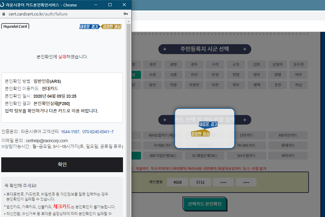 무슨 이유에서인지 계속 "본인확인 실패"가 뜹니다.