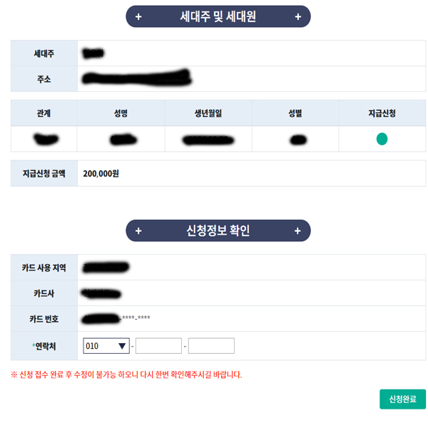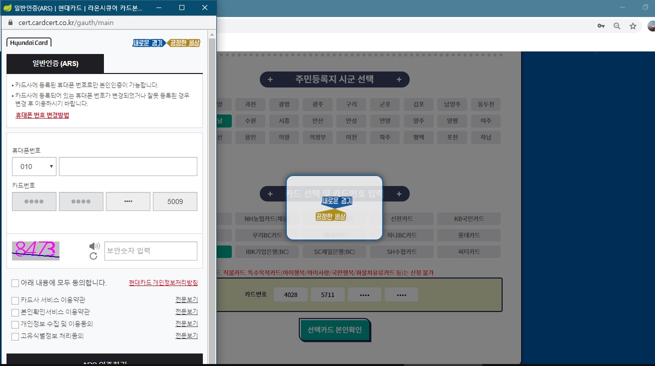 본인의 주민등록지와 사용하는 신용카드 회사 및 카드 번호를 입력합니다.
