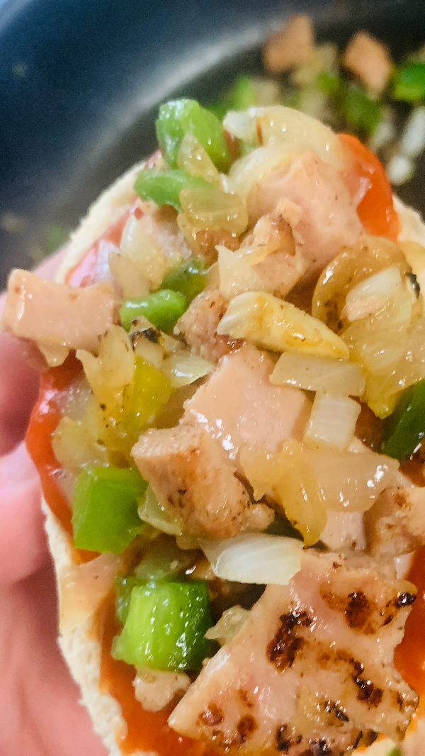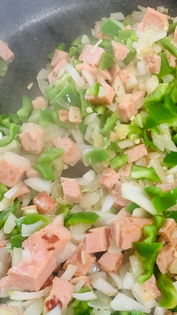 프라이팬에 스팸과 양파를 좀 볶다가