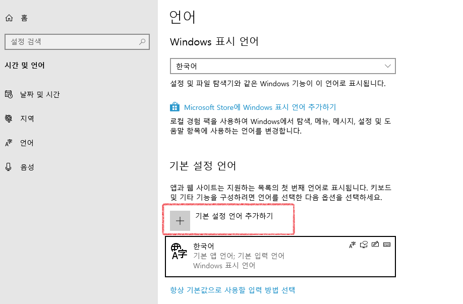 <기본 설정 언어 추가하기> 메뉴가 보일 겁니다.