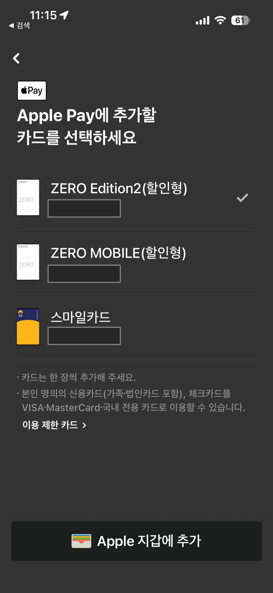- 지갑 메뉴로 들어가서 체크카드/신용카드를 직접 추가도 가능하며,