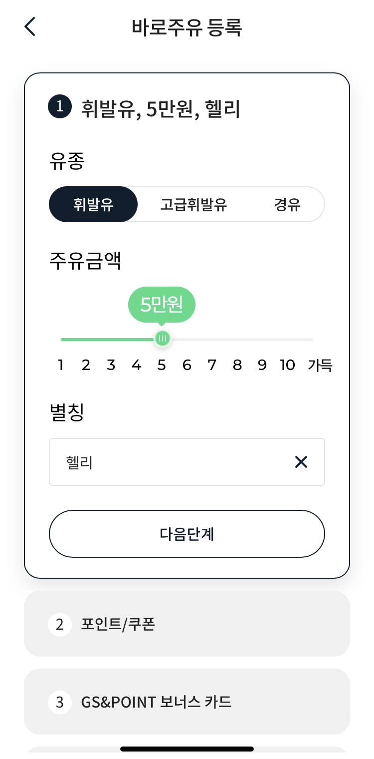 원하는 금액/유종/카드정보만