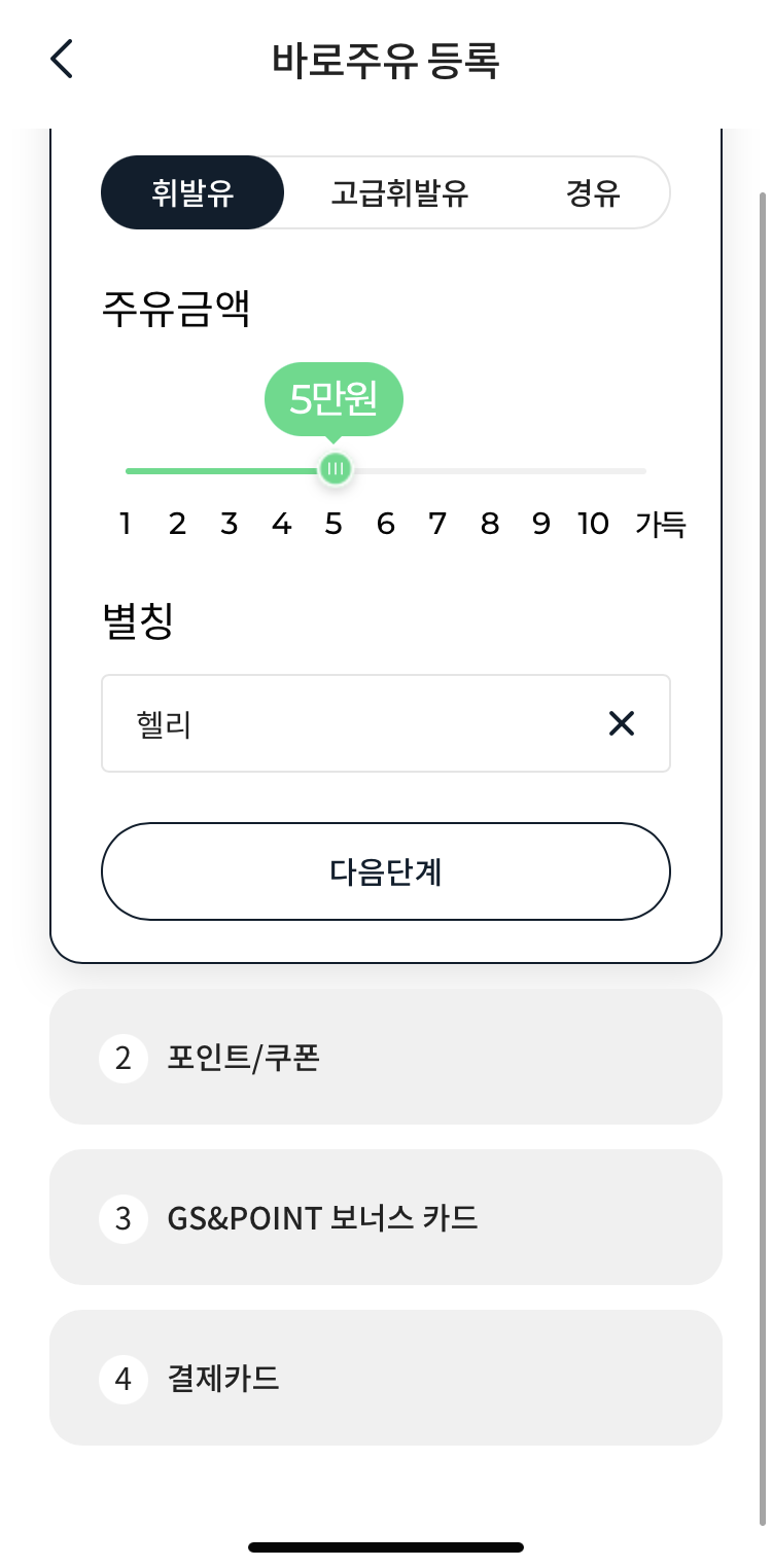 등록한 후에 <바로주유>버튼을 누르면